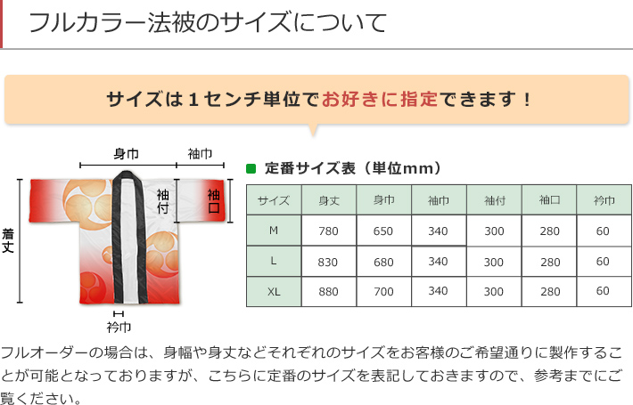 キャンペーンやイベント衣装として用いられる事の多いフルカラー法被は、化繊生地に対してプリントした後で縫製を行い製造を行う関係上、グラデーションや写真などお好きなデザインにてオリジナル作成が可能となります。