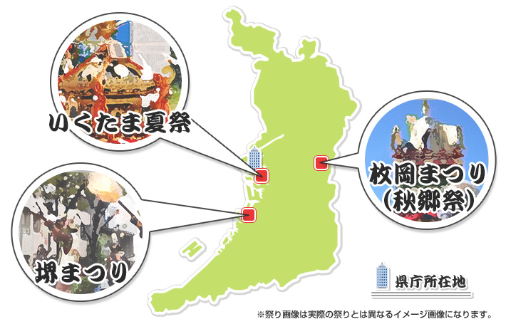 大阪府では「ふとん太鼓」が繰り出す大きな祭りの他、市民参加の一大イベントなどが多彩に開催されています。そこでオリジナル製作された紋入り法被や、激安価格で文字入れ制作したはんてんが多数活躍しています。